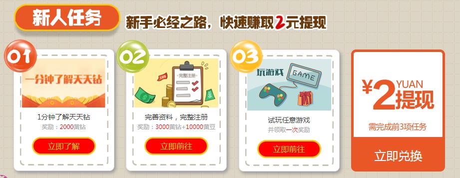 1、点击上面的网址链接进入注册页面,注册好之后完善个人资料,系统会赠送你10000黄钻,10000黄钻=1元人民币,满2元即可提现。